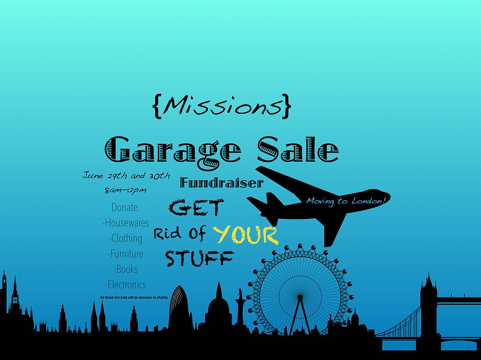 The first step for us to get to London is to raise funds through a missions garage sale. If you have anything you would like to get rid of and donate to the garage sale, let us know! We will gladly take it off yours hand. Whatever does not sell will be donated to charity. Details of where to donate items will be on our personal facebook pages. Garage sale is June 29th and 30th.